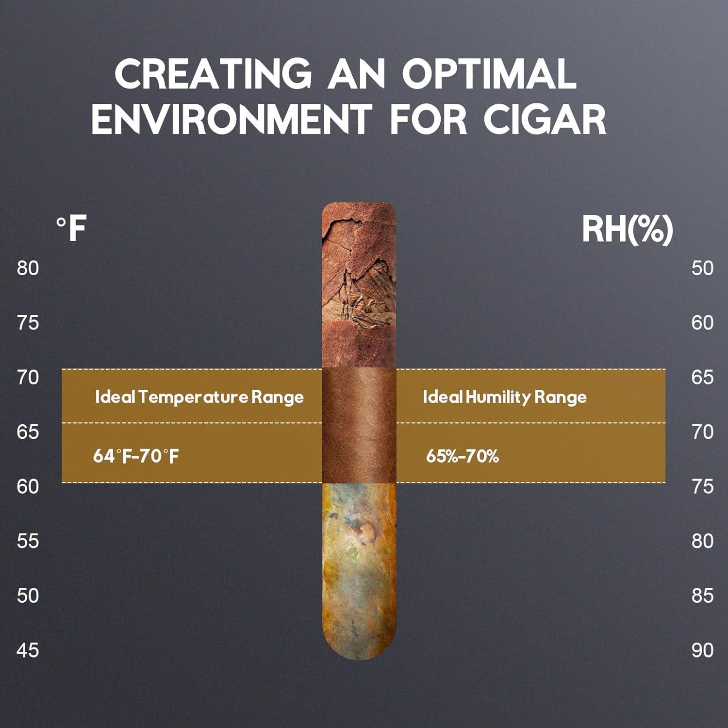 【One Touch Control of Temp and Humidity】Our cigar humidor cabinet has a temperature control range of 59-72°F (15-22°C) and a humidity control range of 60%-75%. Built-in large capacity water tank with a thick sponge, so you don't need to refill water frequently. 360° frost-free air-cooling technology keeps the temperature and humidity at a constant level at every location inside to promote the aging and maturing of your cigars. Energy-saving design, power consumption is < 0.25 kWh/24 hours, cost is < $0.05/day.