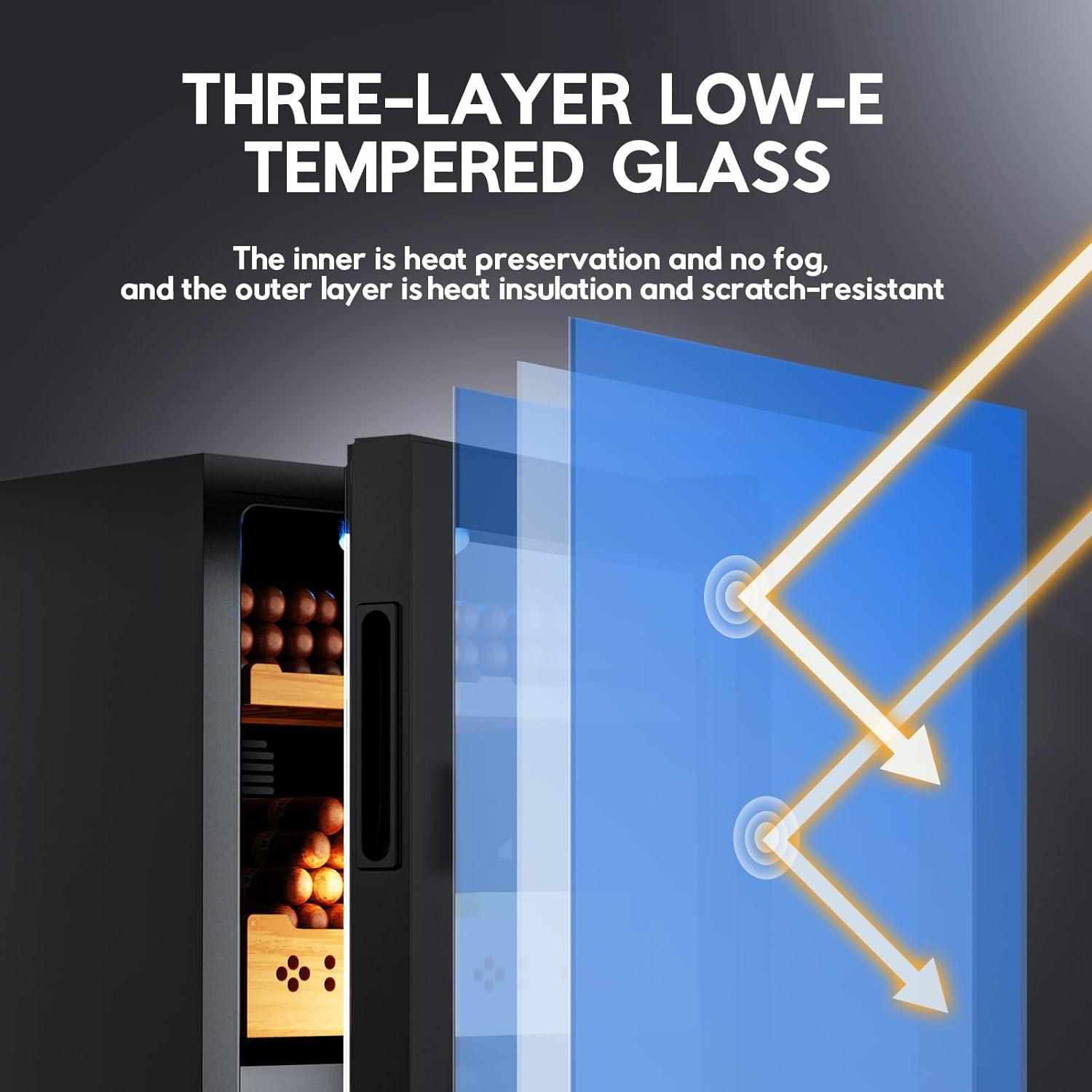 【Low-E Triple Tempered Glass Door】We add Low-E composite coating to the middle layer of the glass, which makes the thermal insulation and heat preservation performance of the glass far superior to its peers. Cigar humidor has an Elegant appearance, equipped with a hidden door handle and 4 adjustable non-slip feet, built-in LED blue light, convenient for you to check the status of your cigars. The LED touch screen panel is equipped with a digital thermometer and hygrometer, intelligent control, and faster response.