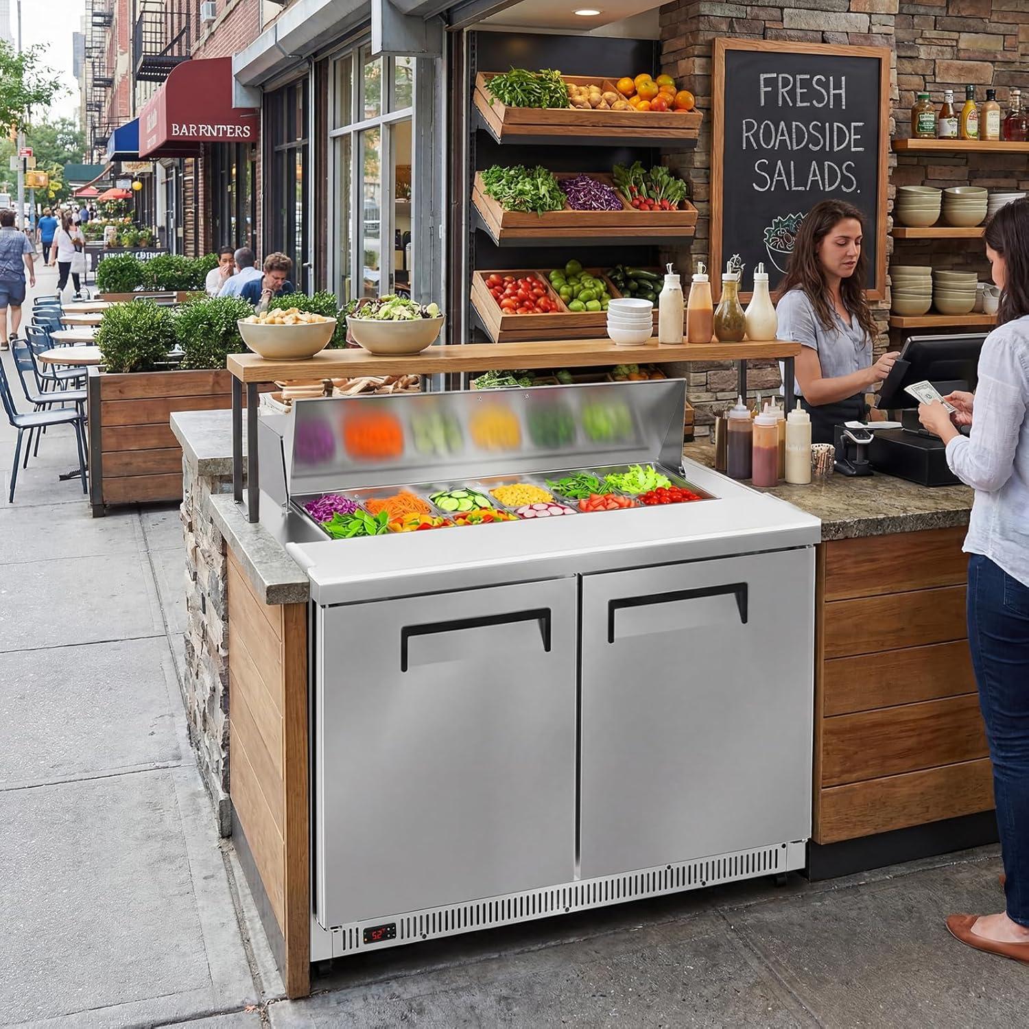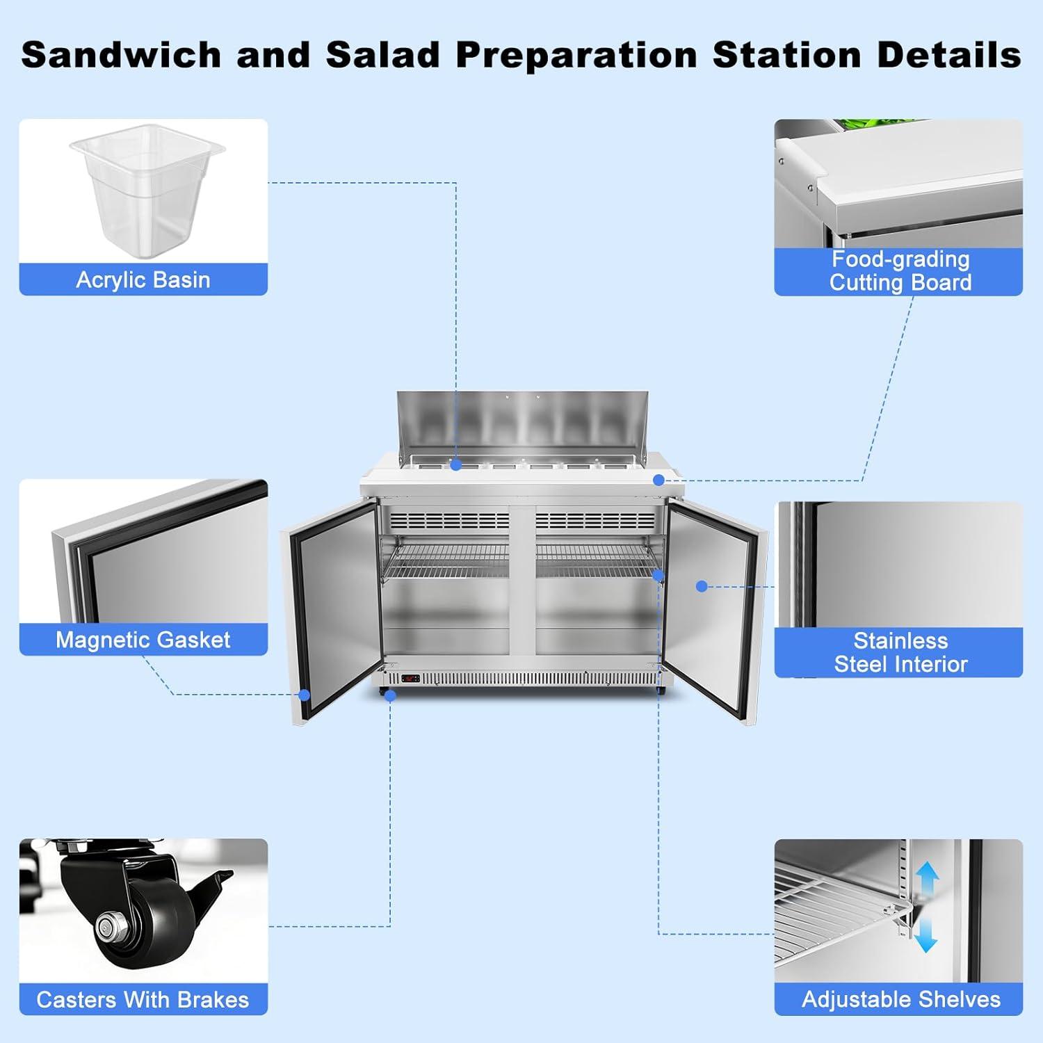 Spacious 48″ Workstation: Maximize prep efficiency with a 48″ W x 9.6″ D work surface and 12.7 cu.ft. storage. Includes 12 food-grade pans and a large cutting board, giving 1-2 chefs ample room to work without crowding during busy rushes