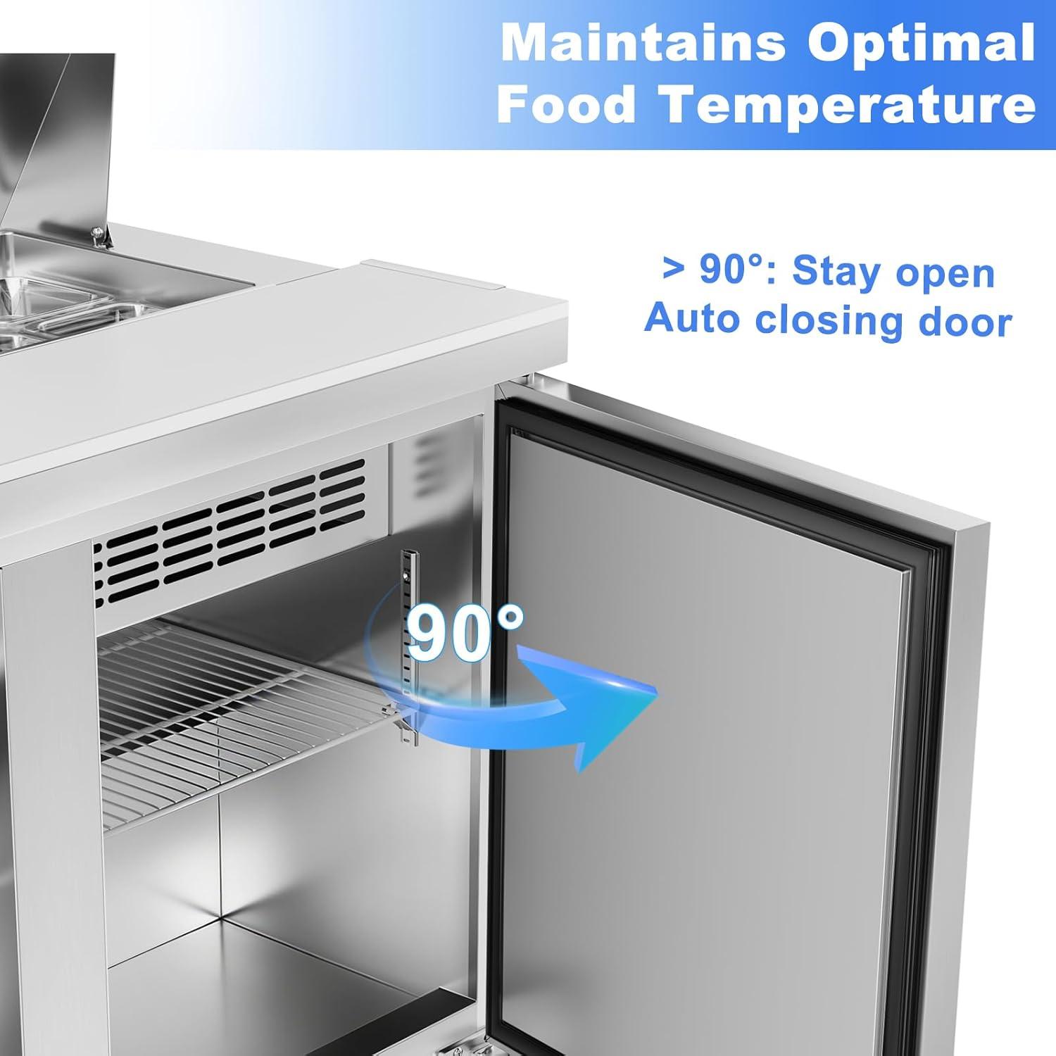 Auto-Close Door & Energy Save: The door automatically snaps shut when opened less than 90 degrees, preventing cold air loss and reducing energy costs. Opens beyond 90 degrees stays put for easy loading and unloading during prep