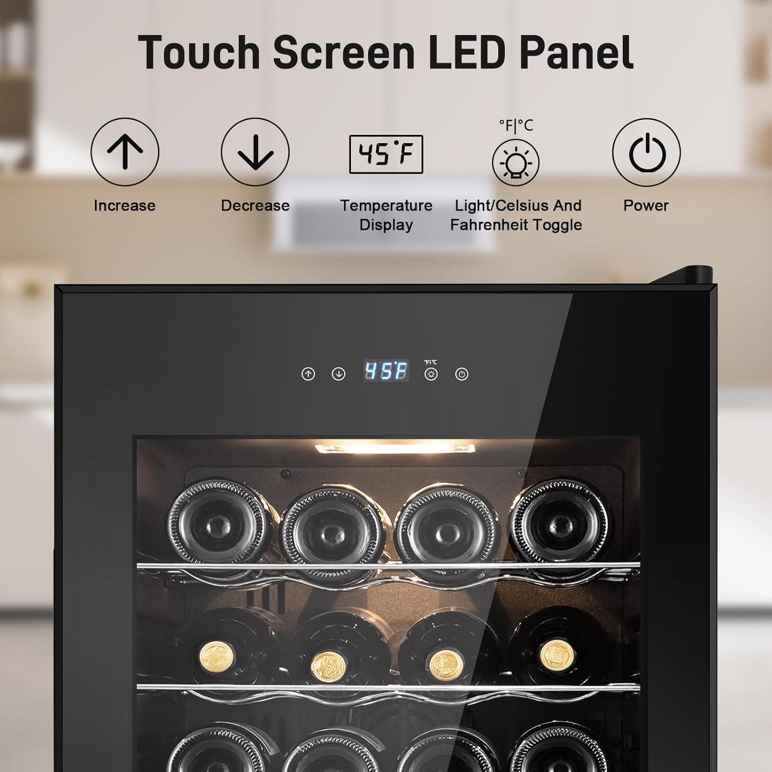 【LED Touchscreen & Smart Chip Control】This mini wine fridge offers a temperature range of 41–65°F, featuring a sleek LED touchscreen panel and an intelligent chip for precise 1°F control. It perfectly simulates a wine cellar environment, making this wine chiller ideal for preserving your favorite red, white, sparkling wines, and so on, while retaining their authentic flavor and aroma.